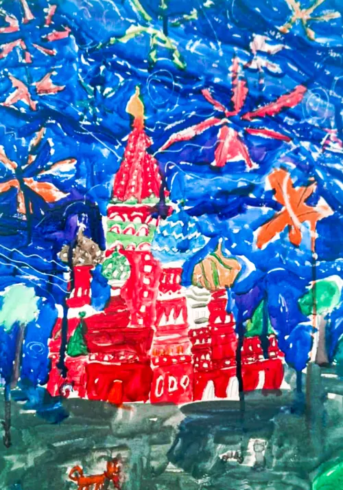 На рисунке изображен День Победы в Великой Отечественной войне 1941-1945 г.г. В темно-синем небе расцветают дивной красоты цветы из фейерверков, а яркие чистые цвета куполов храма Василия Блаженного дарят радость всем посетителям