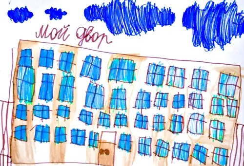 Дмитрий изобразил свой дом, в котором проживает со своими родителями. Дом многоквартирный, у Дмитрия много соседей, они все очень дружно живут, у мальчика там много друзей. Работа выполнена карандашами и фломастерами. Фломастерами мальчик выделил облака, тем самым показав, что его дом высокий "до небес". Дмитрию только 6 лет, и он очень любит рисовать все, что видит вокруг.