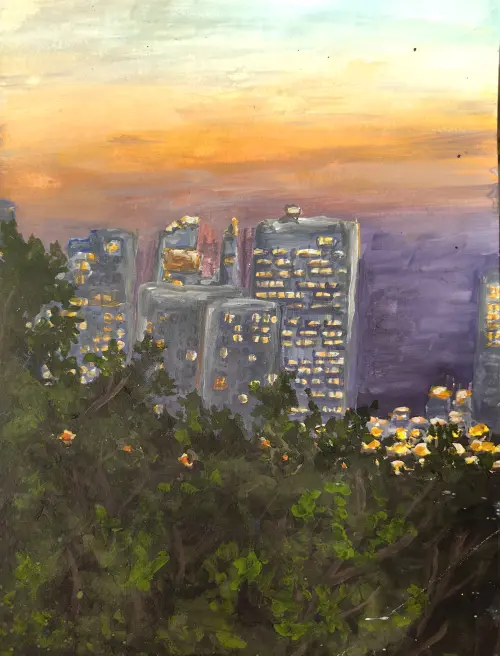 Я смотрю в окно и вижу вечерний город. Небо окрашено в нежные розовые и оранжевые цвета, как будто кто-то раскрасил его красками. Огни домов начинают загораться, и они блестят, как звезды на земле.