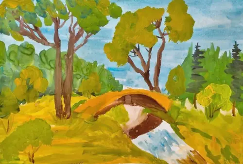 Работа выполнена гуашью, на листе формата А3. В нашем районе есть маленькая речка Рудневка. На рисунке изображён небольшой пешеходный мостик через эту речку.