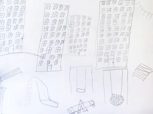 Я нарисовала свой дом и двор. Во дворе у меня детская площадка и магазин. Светит солнце. После школы и на каникулах я провожу очень много времени с друзьями у меня во дворе.