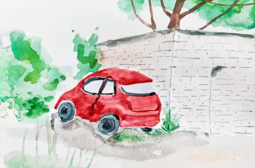 Я нарисовал красную машину. Она стоит во дворе, рядом с домом. Мне нравится рисовать машины, потому что они красивые и умеют быстро ездить. Эта машина отдыхает, а вокруг неё — мой любимый двор.