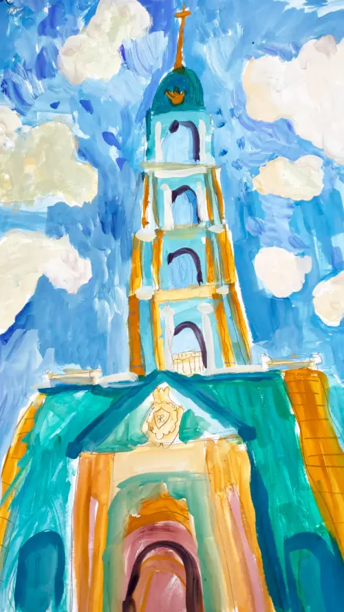 Храм Троицы Живоначальной 1784 года. На работе художника изображён фрагмент храма - колокольня. Вертикальная композиция картины подчеркивает высоту и стремление вверх к облакам. Формат работы А2, техника «гуашь».