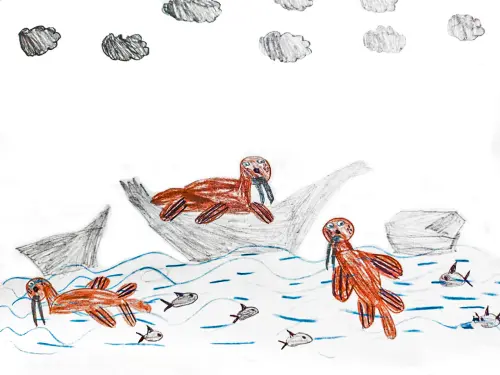 Я часто хожу на занятия по рисованию в зоопарк, я люблю рисовать северных животных. На моей картине моржи, они очень забавные: плавают, играют, плавают.