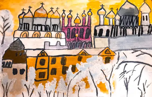 На рисунке изображение красивейших Соборов Московского Кремля. Работа выполнялась гуашью в изо-студии "Гармония", руководитель Цветкова Елена Евгеньевна.
