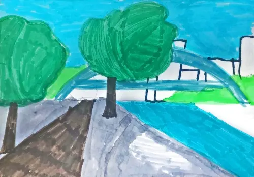 Вид на детский Черкизовский парк, пешеходный мост. Работа выполнена фломастерами.