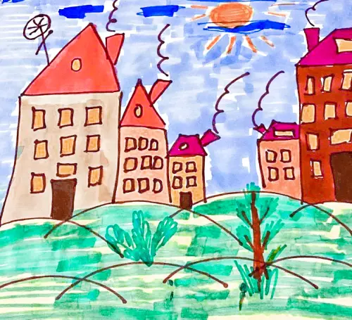 Я нарисовала свой двор, где мы нашей большой семьей гуляем на детской площадке летом, а зимой играем в снежки и катаемся на санках! У нас очень весело, я очень люблю там находиться.