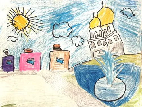 На рисунке изображен Преображенский район, Храм Илии Пророка, Детский Черкизовский пруд с фонтанами.