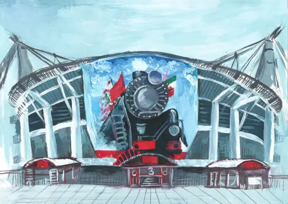 На рисунке изображена спортивная Арена, это бывший стадион Локомотив. Работа выполнена акварелью.