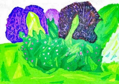 Мое внимание привлекло сочетание цветов: яркой сочной салатовой зелени и фиолетовых клёнов, переливающихся оттенками сиреневого и тёмно-лилового. Природа - самый лучший художник!