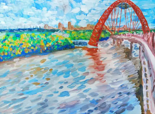 На картине нарисована лишь небольшая часть прекрасного района «Крылатское». Москва-река, Живописный мост, автодорога, небоскрёбы и, конечно же, много зелени.