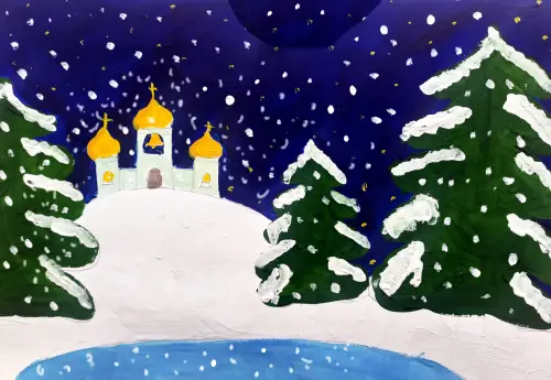 Тематическая композиция. Автор изобразил храм иконы Влахернской Божьей Матери в Кузьминках в ночь перед Крещением. Заснеженная земля, глубокая ночь, тихо падает снег. Всё замерло перед Таинством. Работа формат А3, гуашь.