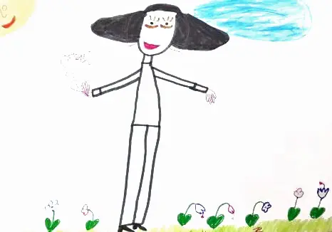 На представленном изображении - девочка Ксюша, совершающая прогулку по луговой местности, украшенной крупными ярко-красными цветами. Тёплые солнечные лучи освещают её лицо. Девочка радушно улыбается прохожим.