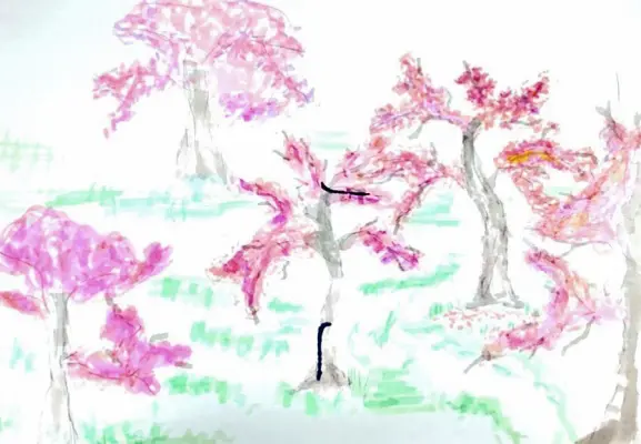 Я нарисовала яблоневый сад весной, когда деревья покрыты облаками нежно-розовых и белых цветков. Между рядами яблонь проложены аккуратные тропинки, ведущие вглубь живописного уголка природы. Солнечные лучи пробиваются сквозь ветви, заставляя лепестки сверкать, а лёгкий ветерок наполняет пространство ароматом цветения.