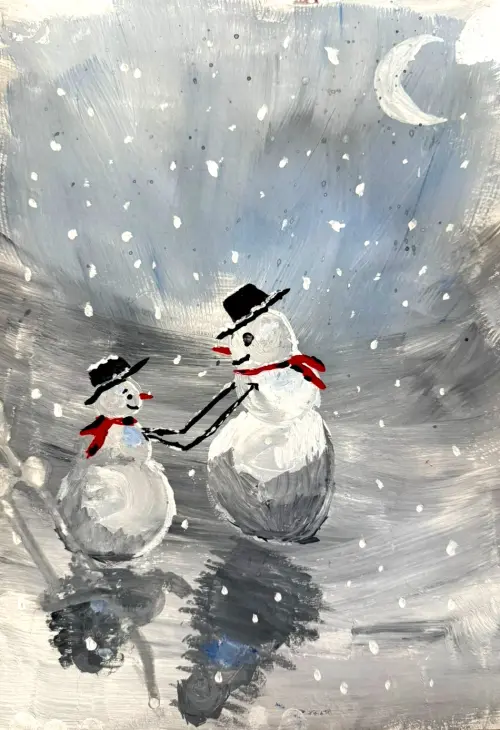 На рисунке два весёлых снеговика, стоящих во дворе, засыпанном снегом. Один снеговик большой и толстый, с ведром на голове и морковкой вместо носа. У него улыбка из угольков и руки-ветки. На шее у него яркий полосатый шарф. Второй снеговик поменьше, с шапкой-ушанкой на голове и пуговицами из камушков. У него тоже улыбающееся лицо. Между снеговиками стоит маленькая ёлочка, украшенная самодельными игрушками. Вокруг снег, на котором видны детские следы. С неба падают крупные хлопья снега. На заднем плане виден деревянный дом с окнами, в которых горит тёплый свет. Всё наполнено атмосферой зимней сказки и предвкушением праздника.