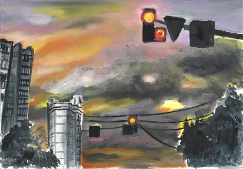 Пасмурное небо с заходящим солнцем над моим любимым районом! Столько красок, ярких сочетаний! Серый, жёлтый, фиолетовый, зелёный, оранжевый, белый, чёрный.