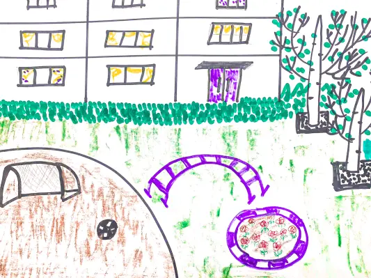 Рисунок передает атмосферу активности, спорта и детства. На нашей спортивной площадке главное место занимает футбольное поле с воротами, где я играю со своими сверстниками.