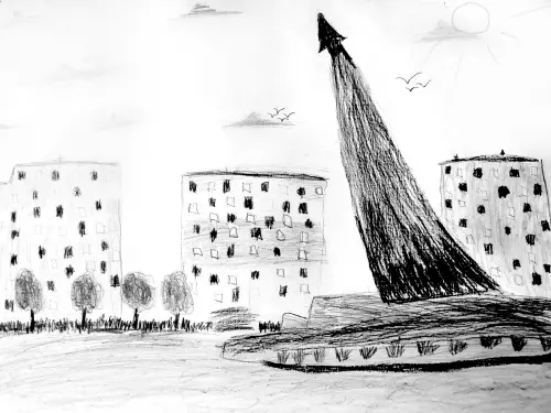 Это милое и живое изображение, на котором запечатлены городские дома, деревья и памятник с огромной стрелой, устремлённой вверх. Картина передаёт ощущение простоты и искренности, а её черно-белая гамма подчёркивает чистоту и естественность пейзажа.