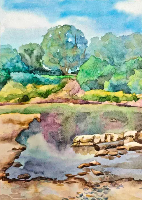 Рисунок выполнен акварелью. На нем изображён Пенягинский пруд, который находится в ландшафтном парке «Митино». Пруд окружён деревьями, а на воде летом можно встретить и даже покормить белых лебедей.
