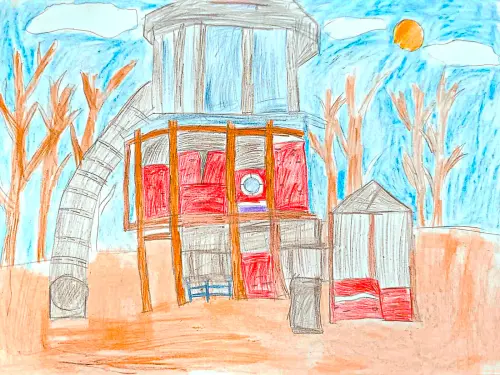 Я живу в районе Марьино, а в летние каникулы с друзьями приезжаем гулять в район Печатники. Нам нравится именно эта площадка, которая изображена на рисунке. Она красивая и удобная для большой компании, а также на ней интересные конструкции. Работа выполнена карандашами и пастельными мелками.