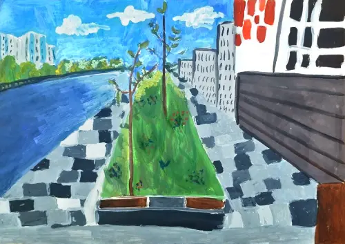 Набережная в жилом комплексе «Ривер Парк Коломенское» в Москве. Набережная протяжённостью полтора километра обустроена вдоль корпусов, в двадцати метрах от воды. Формат А3, гуашь