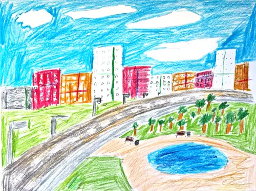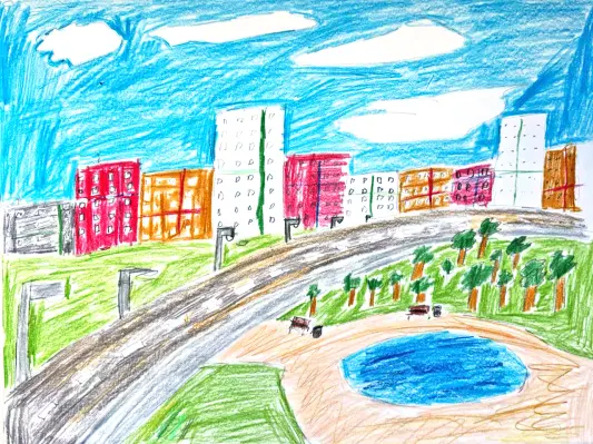На рисунке любимое место для прогулок, пруд, очень красивый район, удобный, для детей есть очень много развлечений, всё не нарисовать в одной картине.