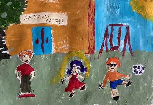 Я была летом в дневном лагере моего района на актёрской смене. Мне там очень понравилось! Я бы хотела, чтобы такие классные активности проводились в моём районе чаще. Поэтому нарисовала нашу прогулку — мы играли в мяч, прыгали на скакалке, танцевали и много ещё интересного. Слева я изобразила нашего вожатого Константина, справа - себя и друга. Я люблю наш район, здесь много интересного для детей!