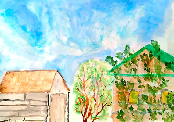 Работа выполнена гуашью. Хотела написать свой район, где я проживаю со своей мамой и младшим братом. Рядом с нашим домом есть березовая роща, в которой мы часто гуляем