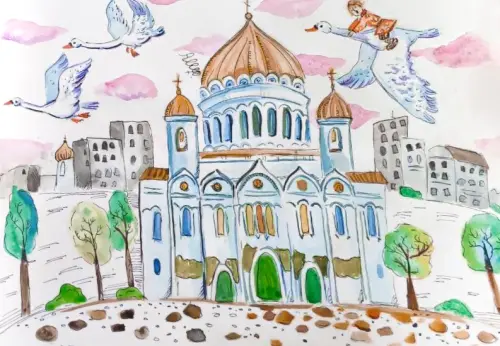 На рисунке запечатлён уютный уголок моего района, где величественная церковь возвышается на фоне ясного неба, а вокруг неё видны сказочные персонажи.