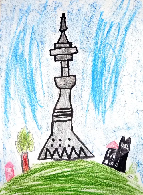 На рисунке изображена телебашня. Это высокое и величественное сооружение возвышается над городом, так что его видно издалека.