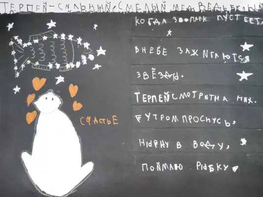 На чёрном листе мишка Терпей смотрит на звёзды. Терпей из белой бумаги. Звезды сложились в рыбку. Звезды нарисованы серебряной ручкой. Терпею нравится звёздная рыбка. Сердечки нарисовала золотой ручкой.