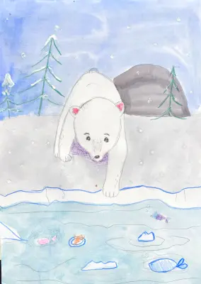 Белые медведи очень любят ловить рыбу и снег, поэтому я решила изобразить как Терпей ловит себе рыбку. А еще на Северном полюсе очень холодно и деревья там практически не растут. Поэтому я для медведя нарисовала елочки.