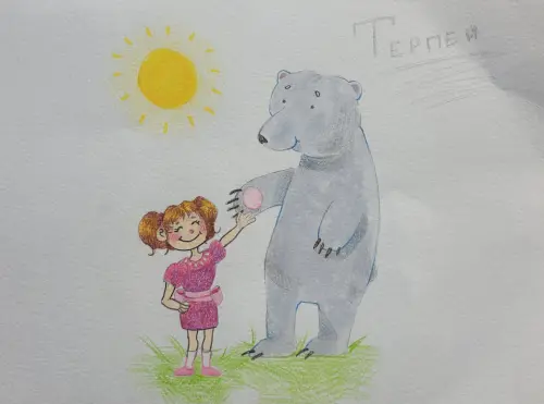 Это мишка белый Терпей. Он прогуливается с моей сестрёнка Кирой! Он такой нежный и ласковый. На улице замечательная летняя погода, светит солнышко. И Кирочка довольная прогулкой с Терпеем!
