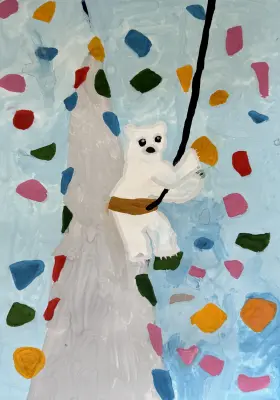 Я изобразила белого медведя Терпея на скалодроме. Недавно я посетила центр скалолазания ЦСКА и мне очень там понравилось лазать по 16-метровым скалам. Я подумала, что было бы здорово представить мишку, который тоже посетил этот скалодром.