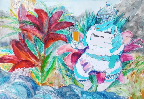 Работа выполнена в коллажной технике, формат А3. Немного фантазийный сюжет родился из идеи нарисовать Терпея, загорающего под Московским солнышком. Дальше всё решили техника и материалы. Самое трудное было - длительность и скурпулезность, которые требует техника коллажа)